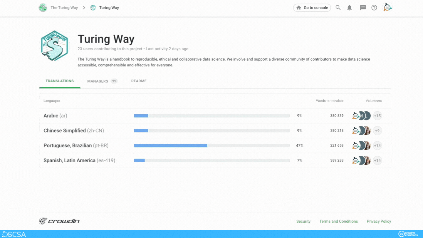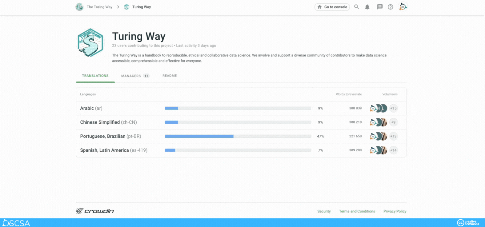 You are now all set up to start translating The Turing Way. In the next chapter, you will learn how to take advantage of the Crowdin editor to translate strings, proofread or add comments.